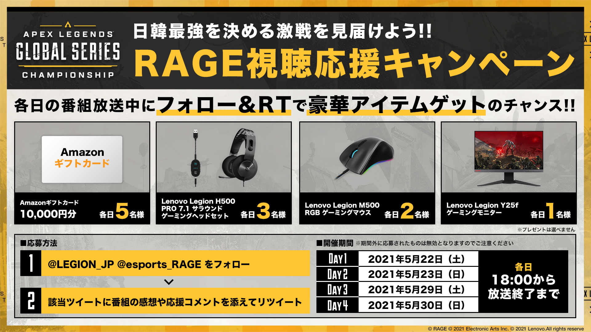 今回2021年5月22日(土)から行われる「Championship – APAC North」は2021/1/30~3/28に行われた、「Winter Circuit Playoffs」の上位10チームと、「Summer Circuit」、「Autumn Circuit」、「Winter Circuit」での累計ポイント上位16チーム(内訳:日本13チーム、韓国3チーム)、2021/4/24~4/25で行われた、「Apex Legends Global Series Championship LCQ」の勝者4チームを合わせた計30チームが集結し、グランドファイナル進出する20チームを決定します。また本大会を記念しTwitterキャンペーンも2021年5月22日(土)より実施いたします。フォロー&リツイートした皆様から抽選でゲーミングモニター等豪華景品をご用意していますので、ぜひご参加ください。北アジア太平洋大会グランドファイナル出場をかけた、激戦をぜひRAGEにてご覧ください。(※)北アジア太平洋大会については賞金$177,300になります。